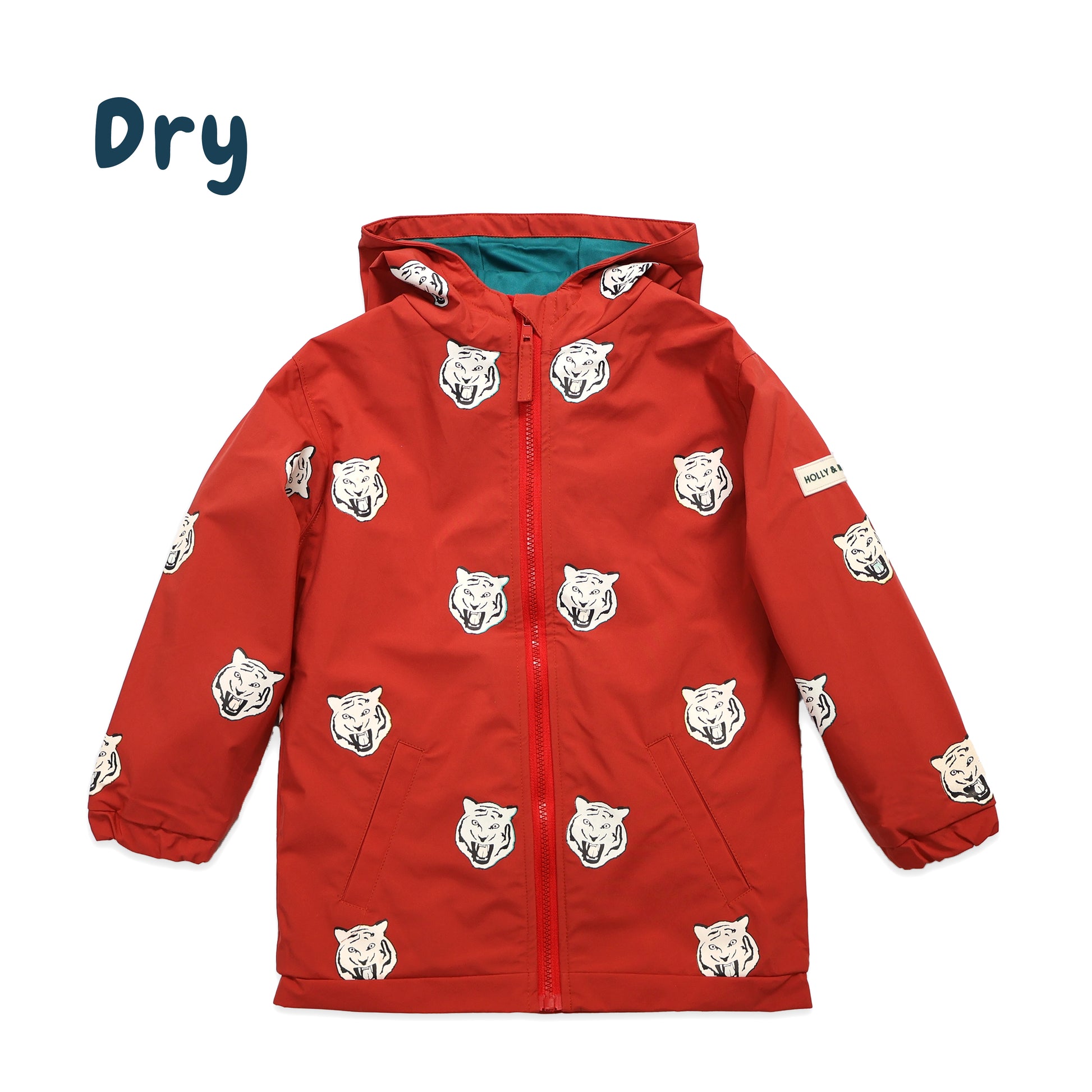 Experience the magic of Holly and Beau's tiger Color Changing Raincoat for kids. Featuring high-quality, breathable, and waterproof recycled polyester, this raincoat keeps your little ones dry and comfortable in any weather.